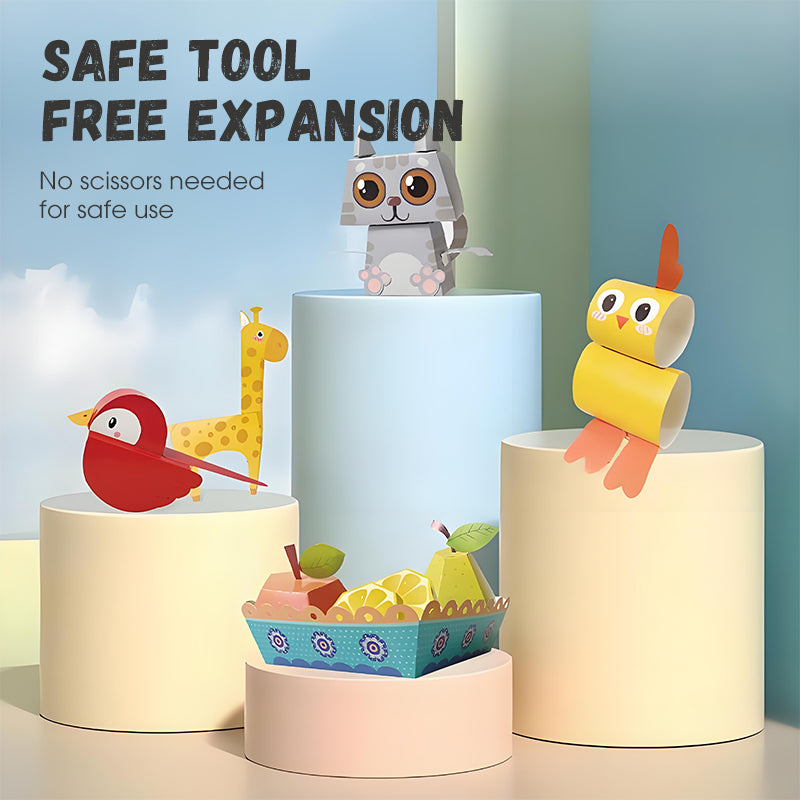 BIZTONSÁGOS ÉS SZERSZÁMMENTES KIALAKÍTÁS: A biztonság elsődleges prioritás. A könyv stancolásos módszerrel készül, olyan papírnyomtatványokkal, amelyeken beépített vágási vonalak vannak, így nincs szükség olló használatára. Ezáltal ideális a kisgyermekek számára, akik anélkül élvezhetik az origamit, hogy megvágnák magukat, és a szülők nyugodtak lehetnek.