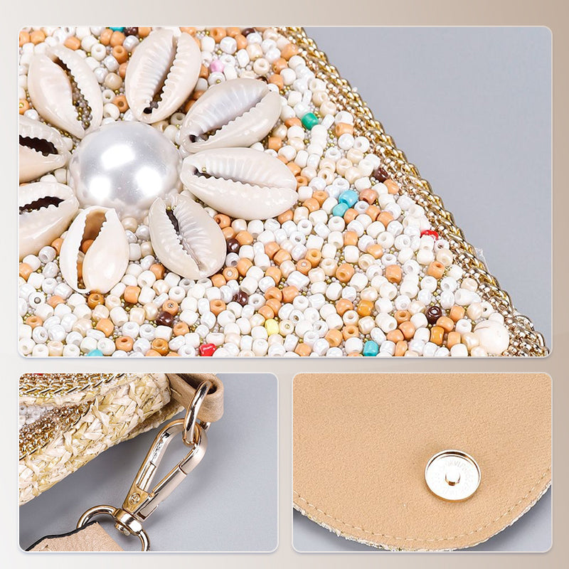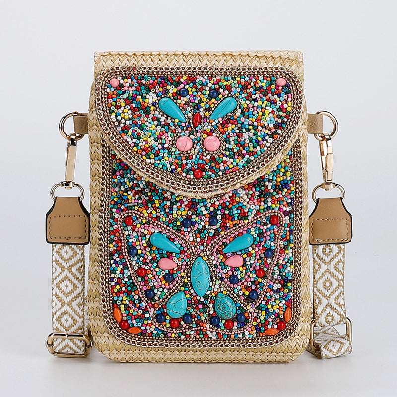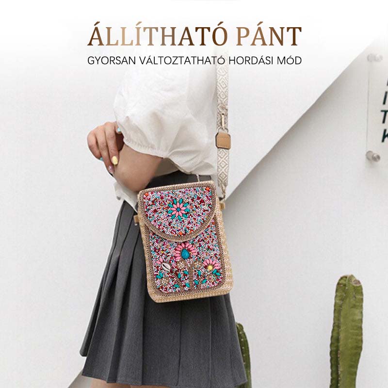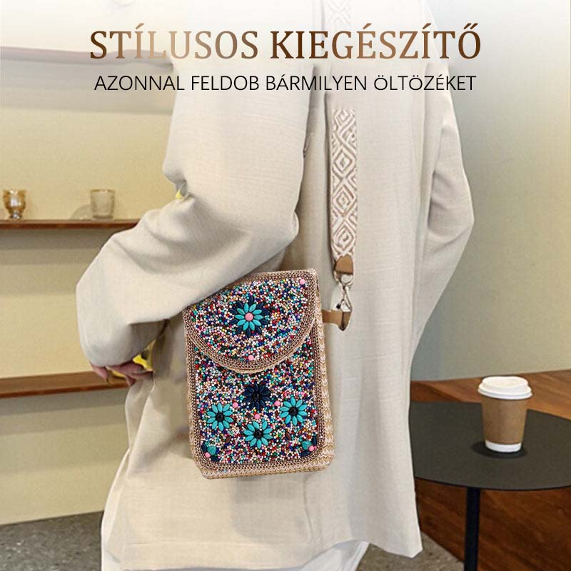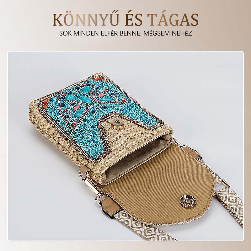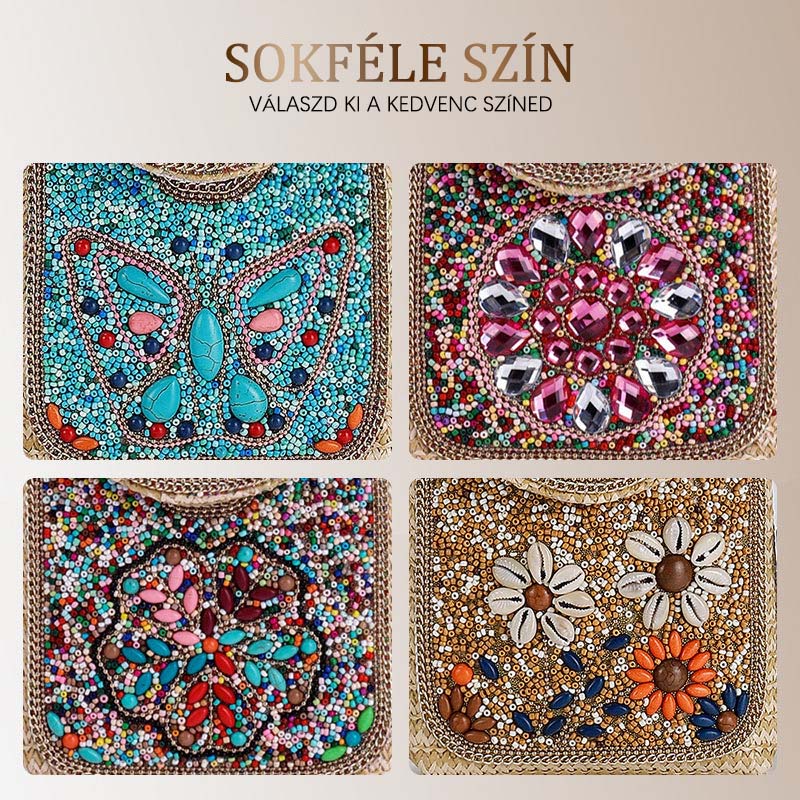 A szett tartalma: 1× Boho Chic kis szalmás táska gyöngyökkel