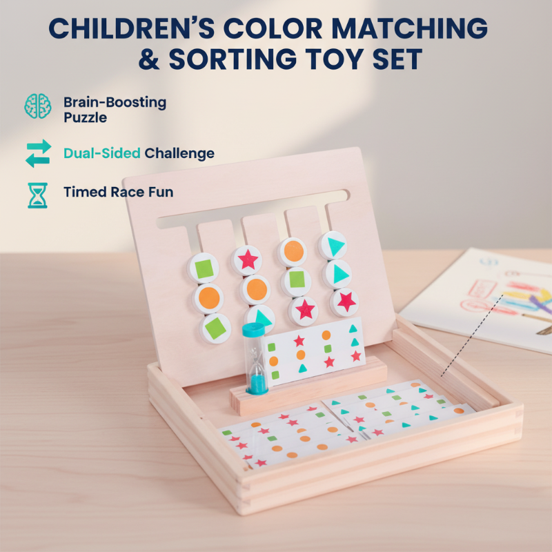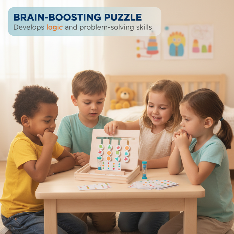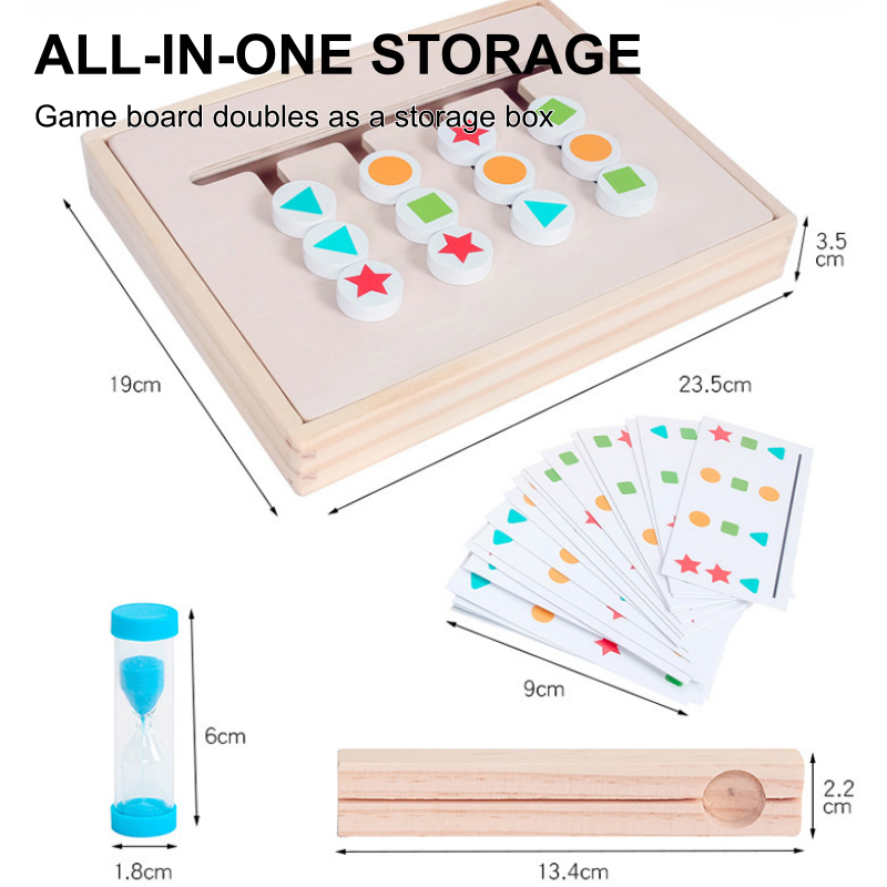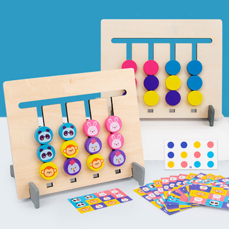 ROZWÓJ UMIEJĘTNOŚCI POZNAWCZYCH – Wspiera rozpoznawanie kolorów i kształtów, zdolność rozwiązywania problemów oraz logiczne myślenie. Dzieci przesuwają elementy, aby dopasować je do wzorów na kartach, co zapewnia praktyczne, angażujące doświadczenie edukacyjne.