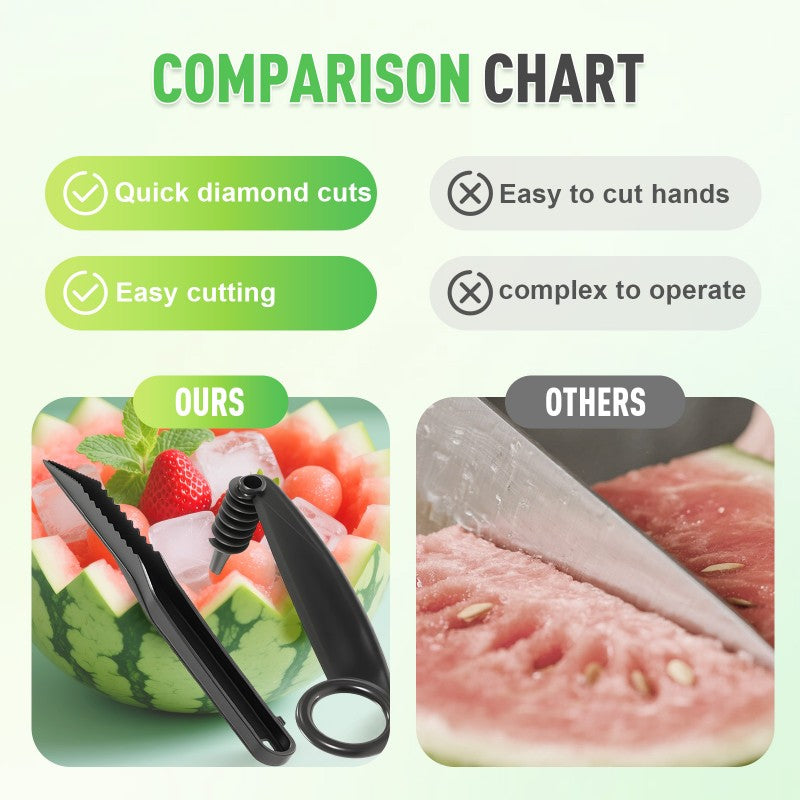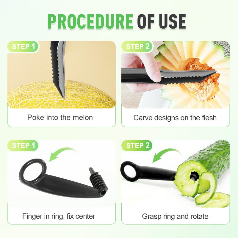 PRECÍZIONÁLISAN KÉSZÍTETT KÉSEK – Élelmiszeripari minőségű rozsdamentes acélból készültek, vastagságuk 3 mm. Ezek a kések sebészi pontossággal vágják a dinnyéket, uborkákat és almákat. A rozsdamentes élek évekig megőrzik élességüket, és éles spirálokat és pengéles V-hornyokat vágnak, amelyek a termékeket ehető, gyönyörű formákká vagy geometriai remekművekké varázsolják.