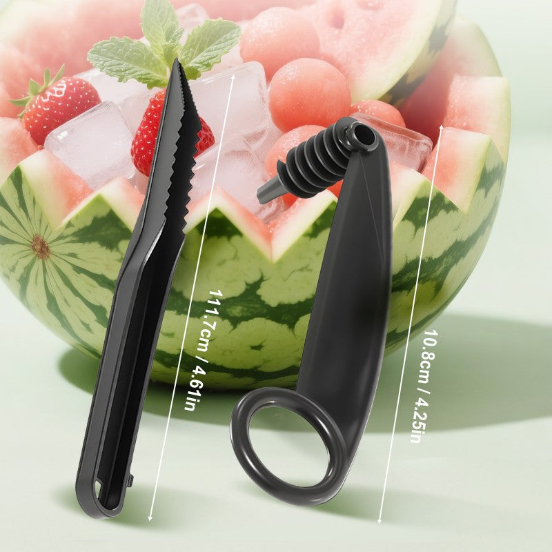KÉT RÉSZES ESZKÖZÖK KREATÍV DÍSZÍTÉSHEZ – A spirálkés citrusfélék héját koktéldíszekké, a cukkinit pedig finom szalagokká alakítja, míg a V alakú vágókés csillag alakú mintákat vág az eperbe vagy bonyolult fonatokat készít az ananászon. Kombinálja a kettőt virágos gyümölcstálakhoz vagy modern zöldségszobrokhoz – nincs szükség tapasztalatra.